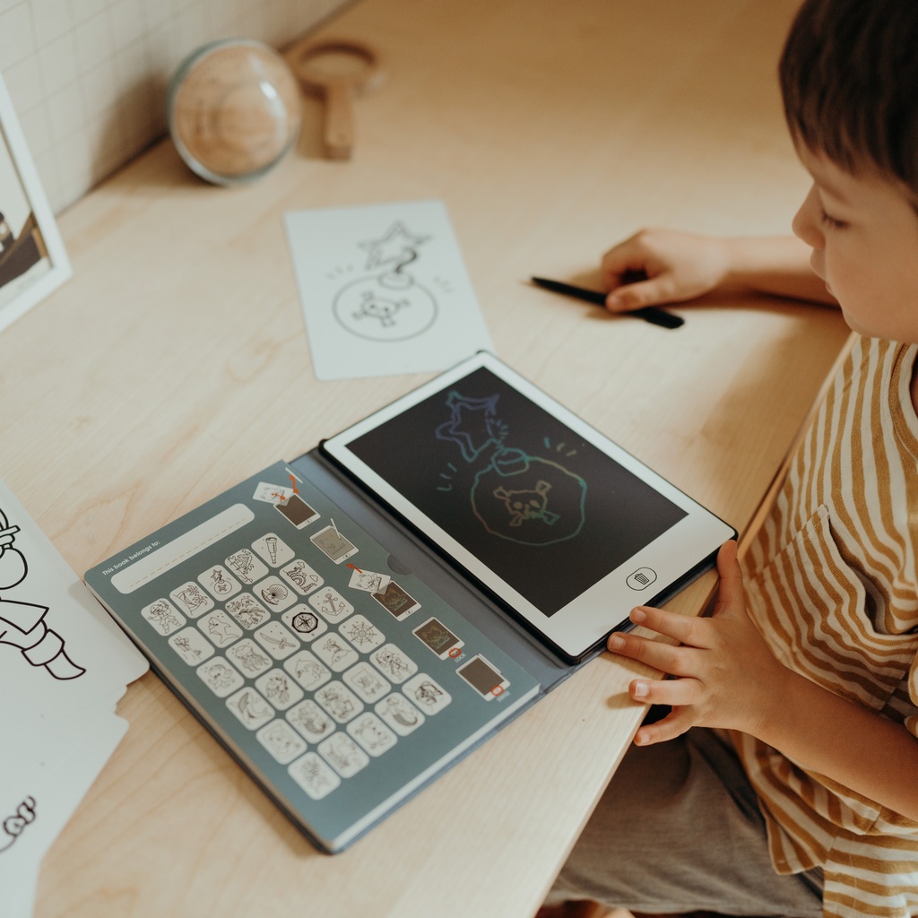 Een tekenboek met LCD-scherm met 30 overdraagbare illustraties. Ideaal om creativiteit en zelfstandigheid te stimuleren.