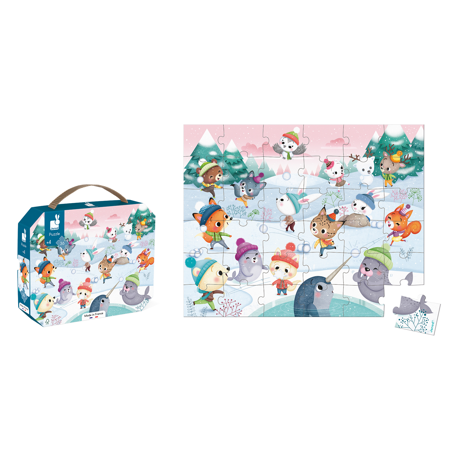 Kijk hoe de dieren een sneeuwballengevecht aangaan, en ontwikkel je geheugen en behendigheid met deze mooie kartonnen puzzel van 36 stukjes. Geschikt voor kinderen van 4-6 jaar. Deze puzzel kan in zijn leuke koffer met stoffen handvat eenvoudig overal mee naartoe worden genomen. Bevat een poster die voor de beginners als model dient, terwijl meer ervaren kinderen de puzzel zonder enige hulp zelf kunnen maken. FSC-gecertificeerd karton en plantaardige inkt.
